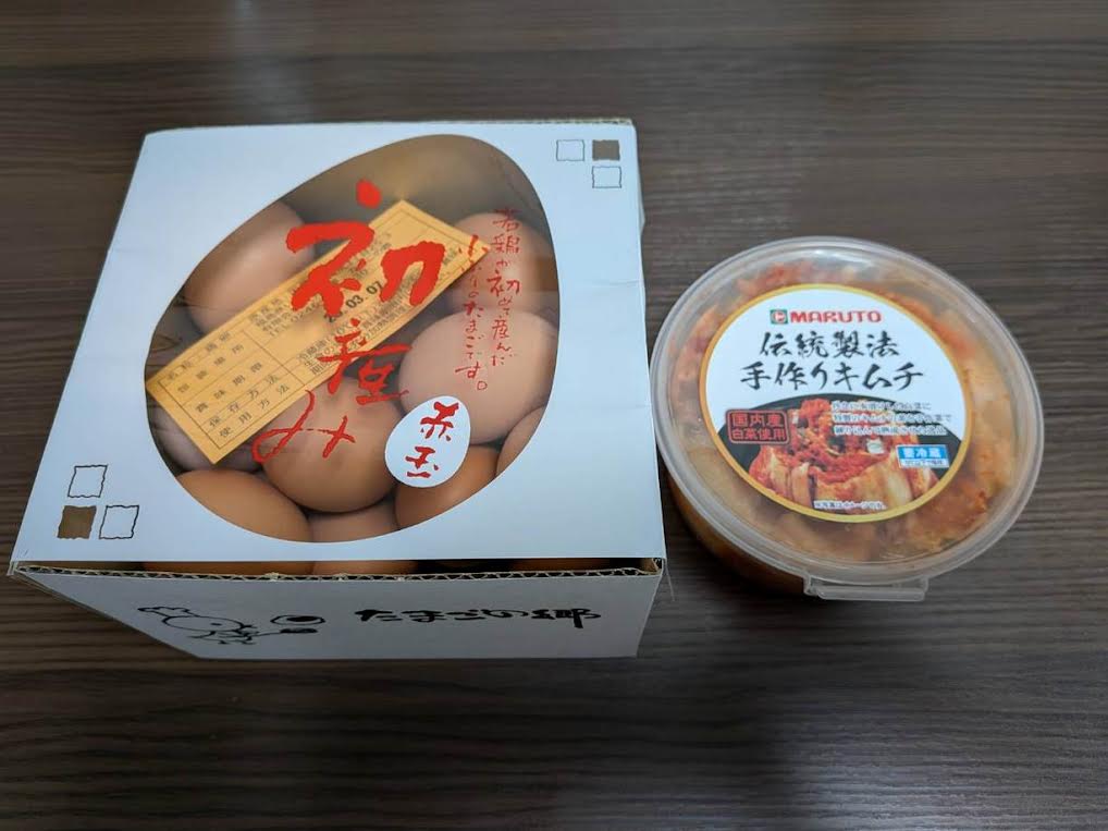 今回は初産みの卵とキムチを頂きました。